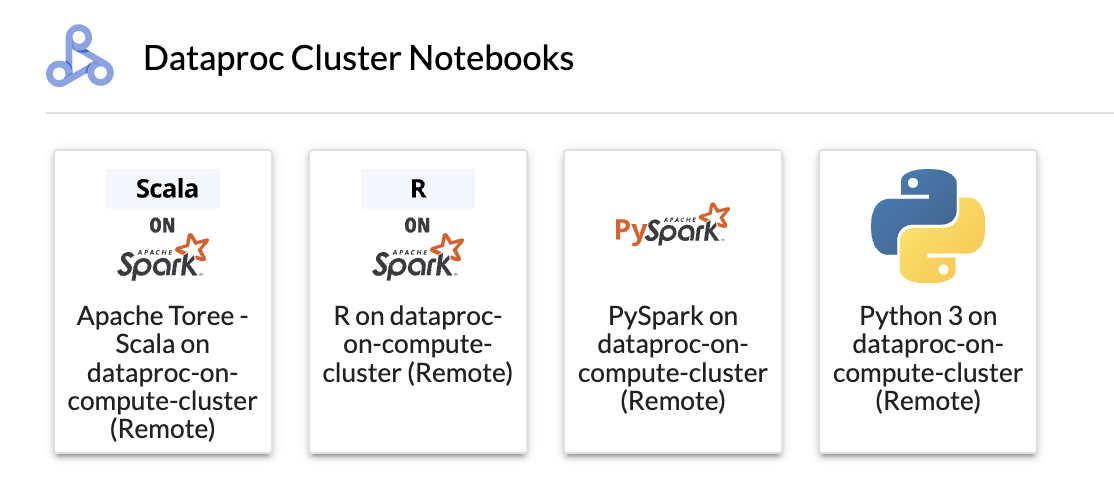 After installing the Dataproc JupyterLab extension, you can view and manage Google Cloud Serverless for Apache Spark and Dataproc on Compute Engine from the Dataproc Jobs and Sessions section on the JupyterLab Launcher page.
