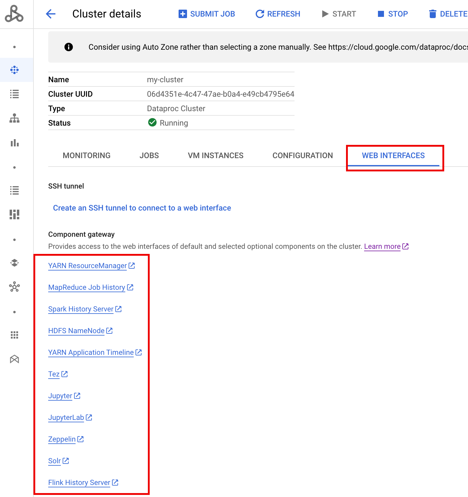 Vai al modulo Cluster Dataproc nella console Google Cloud , quindi seleziona il cluster per aprire il modulo Dettagli cluster. Fai clic sulla scheda Interfacce web per visualizzare un elenco di link del gateway dei componenti alle interfacce web dei componenti predefiniti e facoltativi installati sul cluster. Fai clic su un link per aprire l'interfaccia web in esecuzione sul nodo master del cluster nel browser locale.
