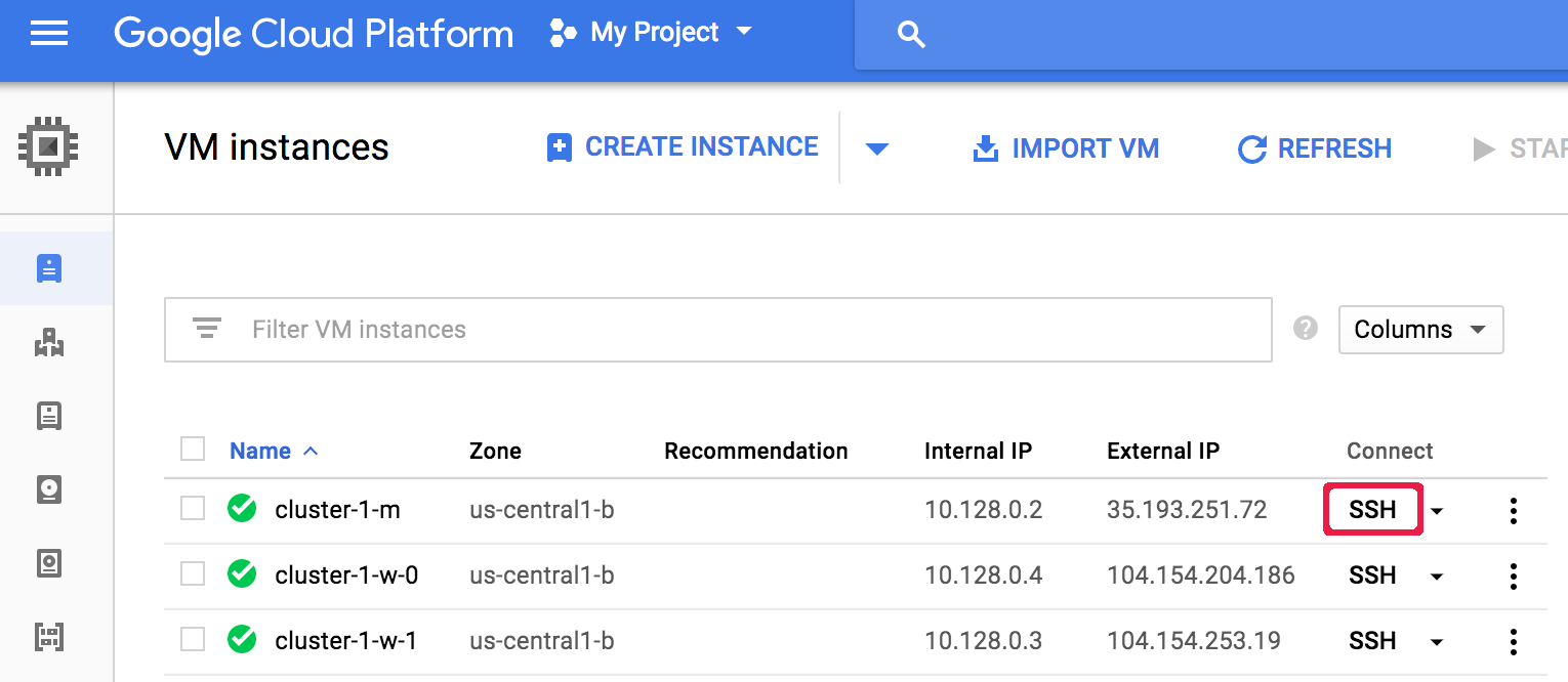 cluster node from the VM Instances tab on the Dataproc