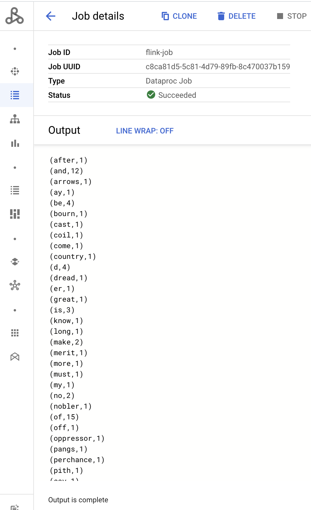 flink run -c org.apache.beam.examples.WordCount word-count-beam-bundled-0.1.jar \ --runner=FlinkRunner \ --output=gs://BUCKET_NAME/java-wordcount-outPeriksa apakah hasil telah ditulis ke bucket Cloud Storage Anda.