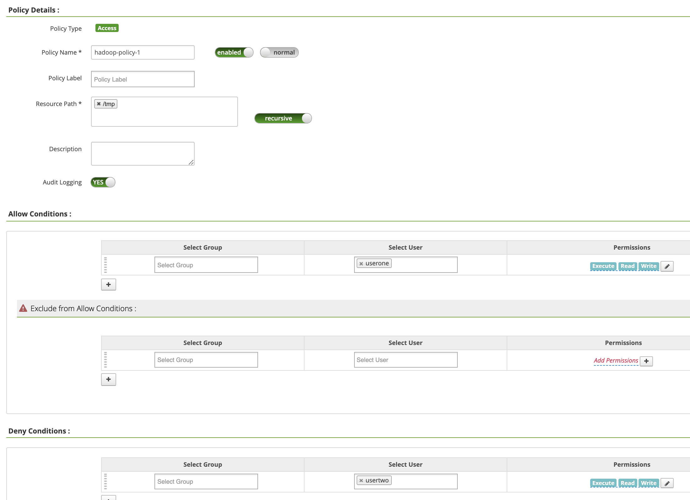 Policy Name: "hadoop-policy-1"Resource Path: "/tmp"Audit Logging: "Yes"Allow Conditions:Select User: "userone"Permissions: "Select All" to grant all permissions