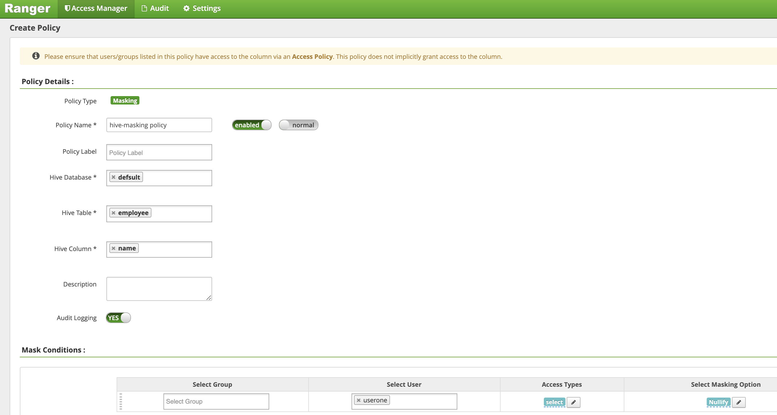 Policy Name: "hive-masking policy"database: "default"table: "employee"Hive Column: "name"Audit Logging: "Yes"Mask Conditions:Select User: "userone"Access Types: "select" add/edit permissionsSelect Masking Option: "nullify"