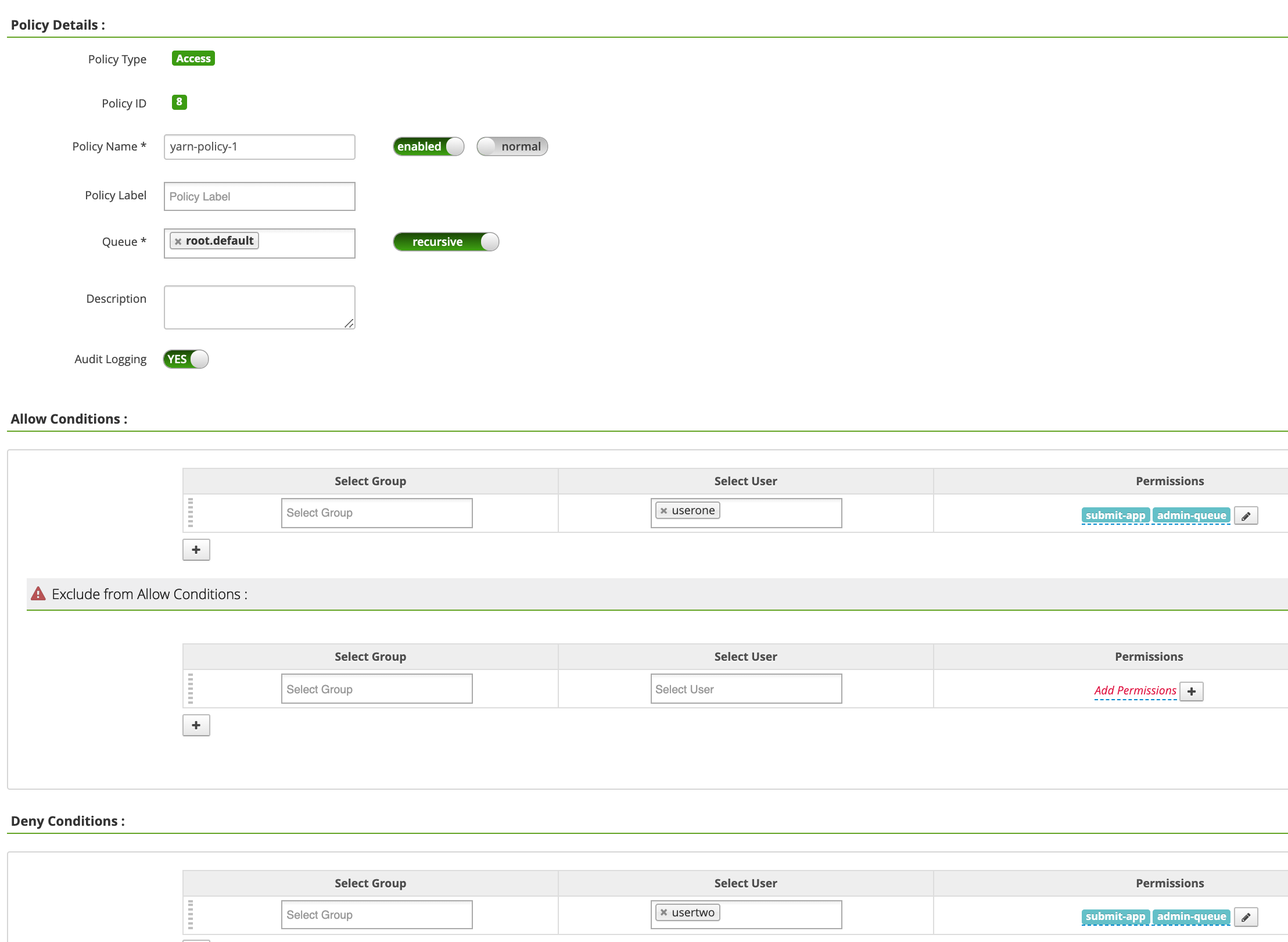 Policy Name: "yarn-policy-1"Queue: "root.default"Audit Logging: "Yes"Allow Conditions:Select User: "userone"Permissions: "Select All" to grant all permissions