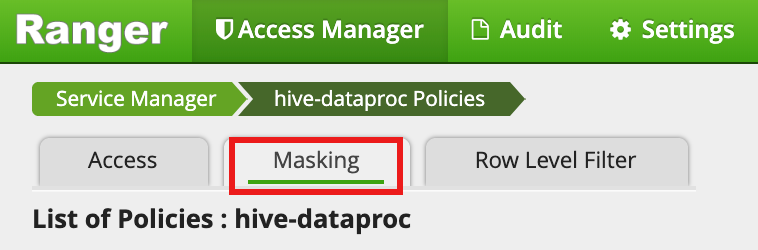 hive-dataprocfrom the Ranger Admin UI, then select the Masking tab and click Add New Policy.