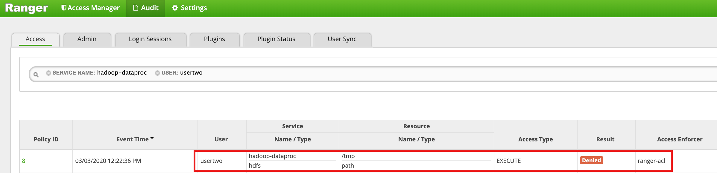 yarn-dataprocfrom the Ranger Admin UI.