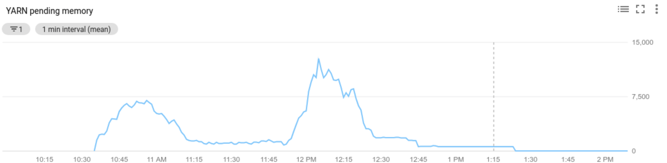 Puedes ver estas métricas en Cloud Monitoring. Como configuración predeterminada, la memoria YARN será 0.8 * memoria total en el clúster, con memoria restante reservada para otros daemons y uso del sistema operativo, como la caché de la página. Puedes anular el valor predeterminado con la configuración de YARN “yarn.nodemanager.resource.memory-mb” (consulta Apache Hadoop YARN, HDFS, Spark y propiedades relacionadas).