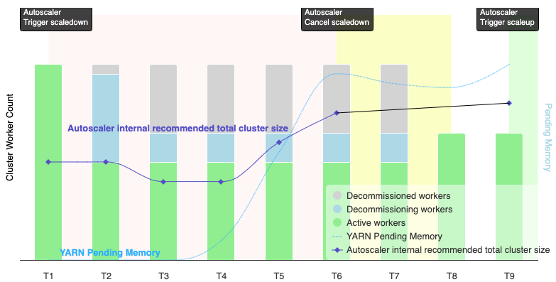 T5: YARN の保留中のメモリが増加し、オートスケーラーによる推奨ワーカー数の変更が増えます。ただし、アクティブ ワーカー数に、推奨されるワーカー数の変更を加えると、アクティブ ワーカー数とデコミッション ワーカーの数の合計未満になり、キャンセル条件を満たしていないため、スケールダウン オペレーションがキャンセルされません。