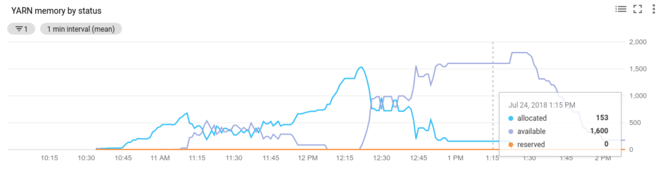 これらの指標は Cloud Monitoring で確認できます。デフォルトでは、クラスタ上の YARN メモリは「0.8 × 合計メモリ」となり、残りのメモリは他のデーモンや、ページ キャッシュなどオペレーティング システムでの使用に予約されます。このデフォルト値は、yarn.nodemanager.resource.memory-mb の YARN 構成設定でオーバーライドできます(Apache Hadoop YARN、HDFS、Spark、関連プロパティをご覧ください)。