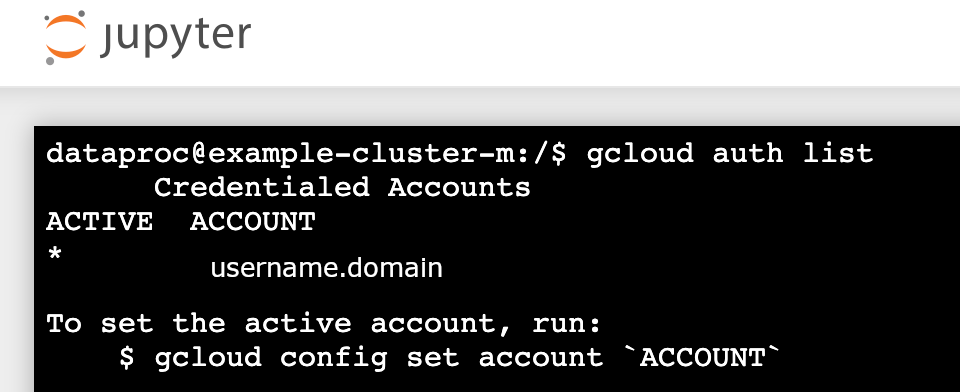gcloud dataproc clusters create CLUSTER_NAME \ --properties=dataproc:dataproc.personal-auth.user=your-email-address \ --enable-component-gateway \ --optional-components=JUPYTER \ --region=REGION