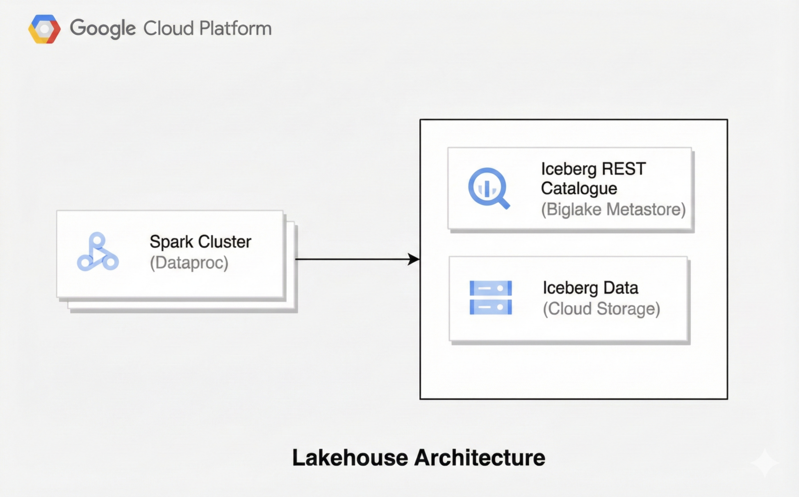 A lakehouse architecture combines the flexibility of a data lake with the data management features of a data warehouse. This document shows you how to set up a lakehouse on Google Cloud. You use Apache Iceberg as the table format, Apache Spark on Dataproc for processing, and the BigQuery Iceberg REST Catalog for unified metadata management.