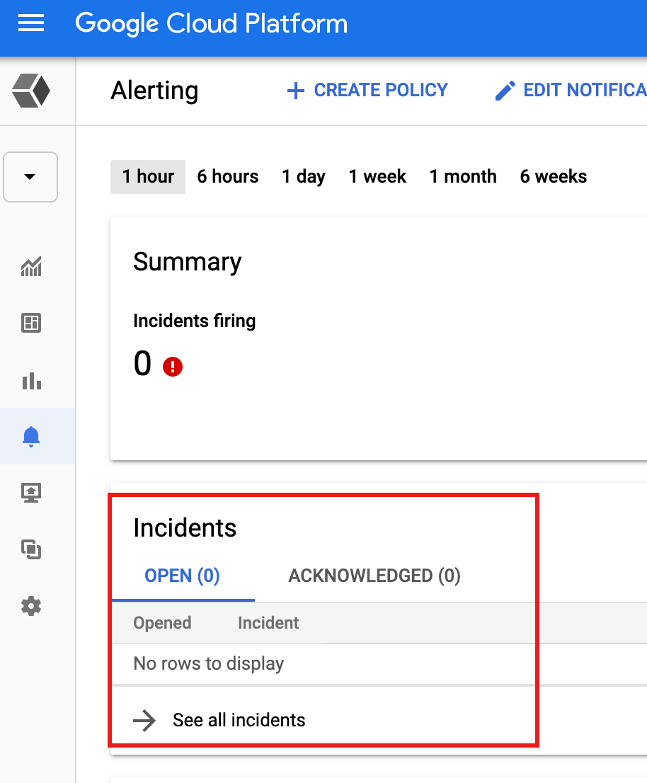 측정항목 기준 조건에 의해 알림이 트리거되면 Monitoring에서 사고와 해당 이벤트를 만듭니다. Google Cloud 콘솔의 Monitoring Alerting 페이지에서 사고를 볼 수 있습니다.