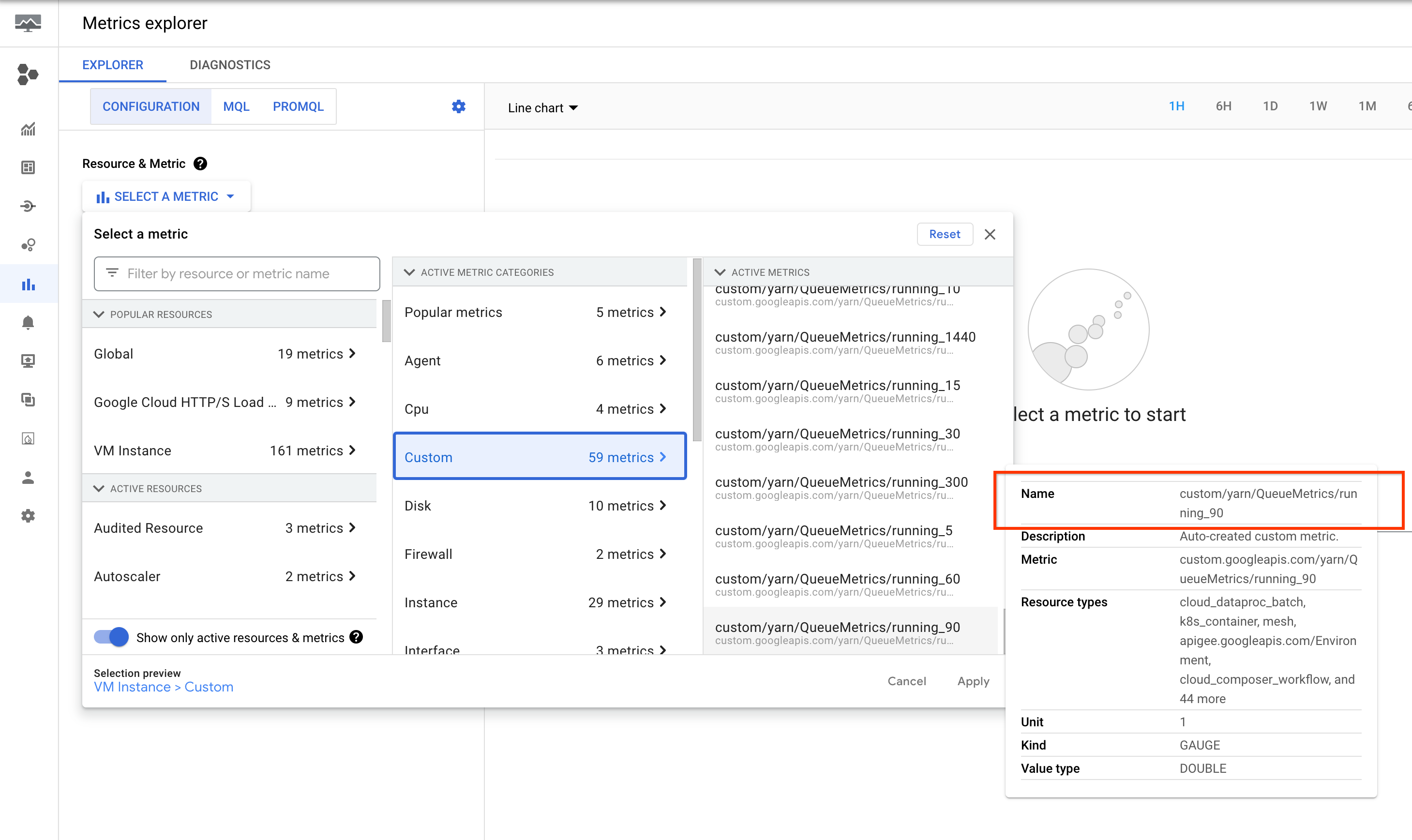 gcloud dataproc clusters create test-cluster \ --properties ^#^yarn:yarn.resourcemanager.metrics.runtime.buckets=30,60,90 \ --metric-sources=yarn \ --metric-overrides=yarn:ResourceManager:QueueMetrics:running_0,yarn:ResourceManager:QueueMetrics:running_30,yarn:ResourceManager:QueueMetrics:running_60,yarn:ResourceManager:QueueMetrics:running_90
