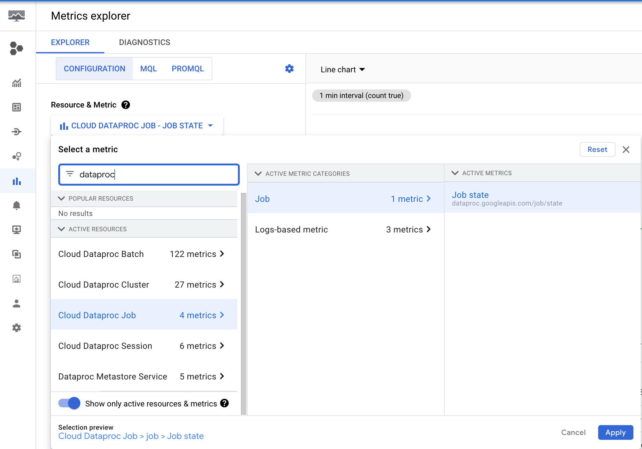 - In the "Filter by resource or metric name" input box, type "dataproc" to list Dataproc metrics. Navigate through the hierarchy of Cloud Dataproc metrics to select a cluster, job, batch, or session metric.