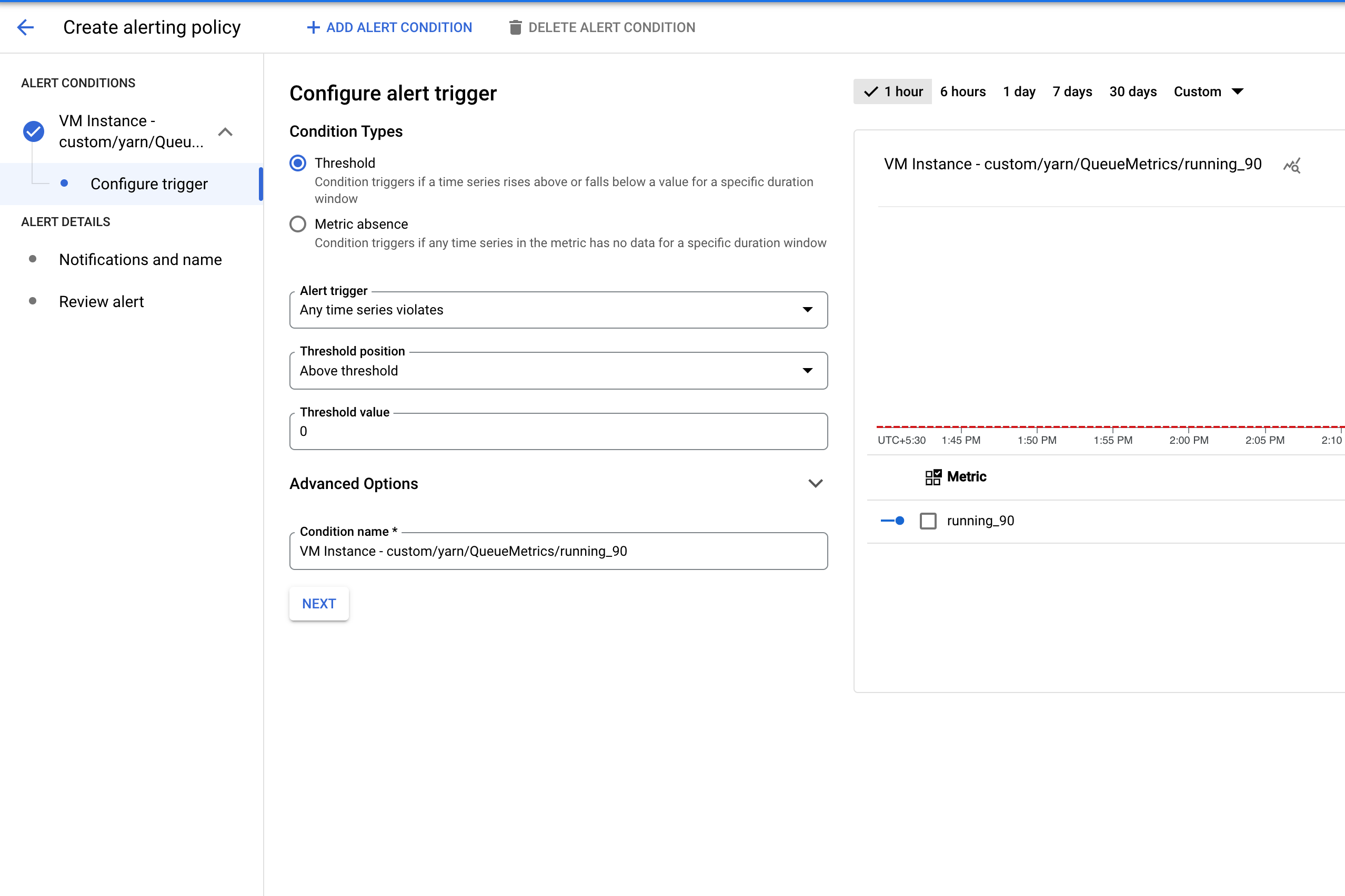 - Set a threshold value to trigger the alert.