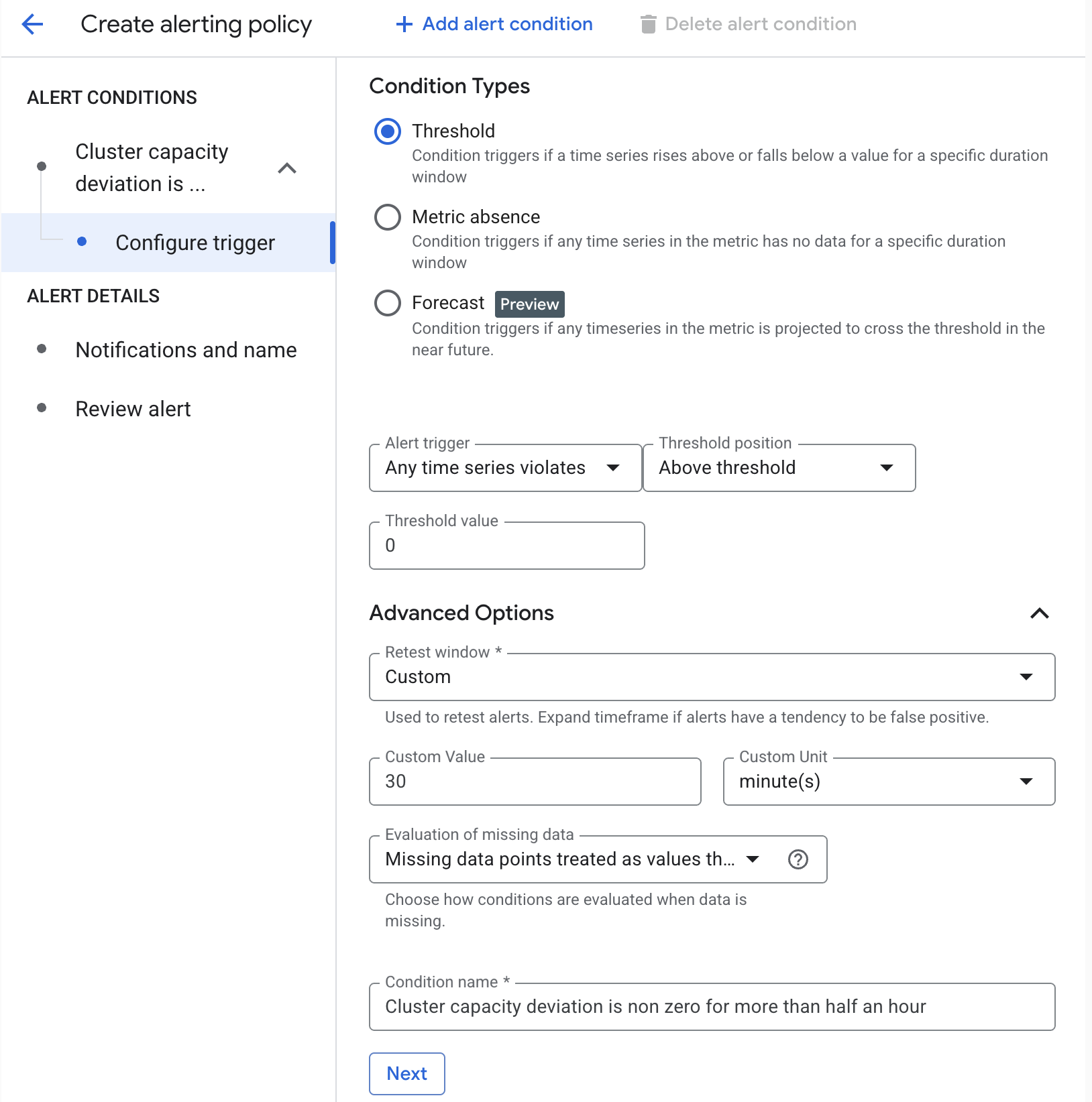 In the next example, the alert triggers when cluster capacity deviation is non-zero for more than 30 minutes.