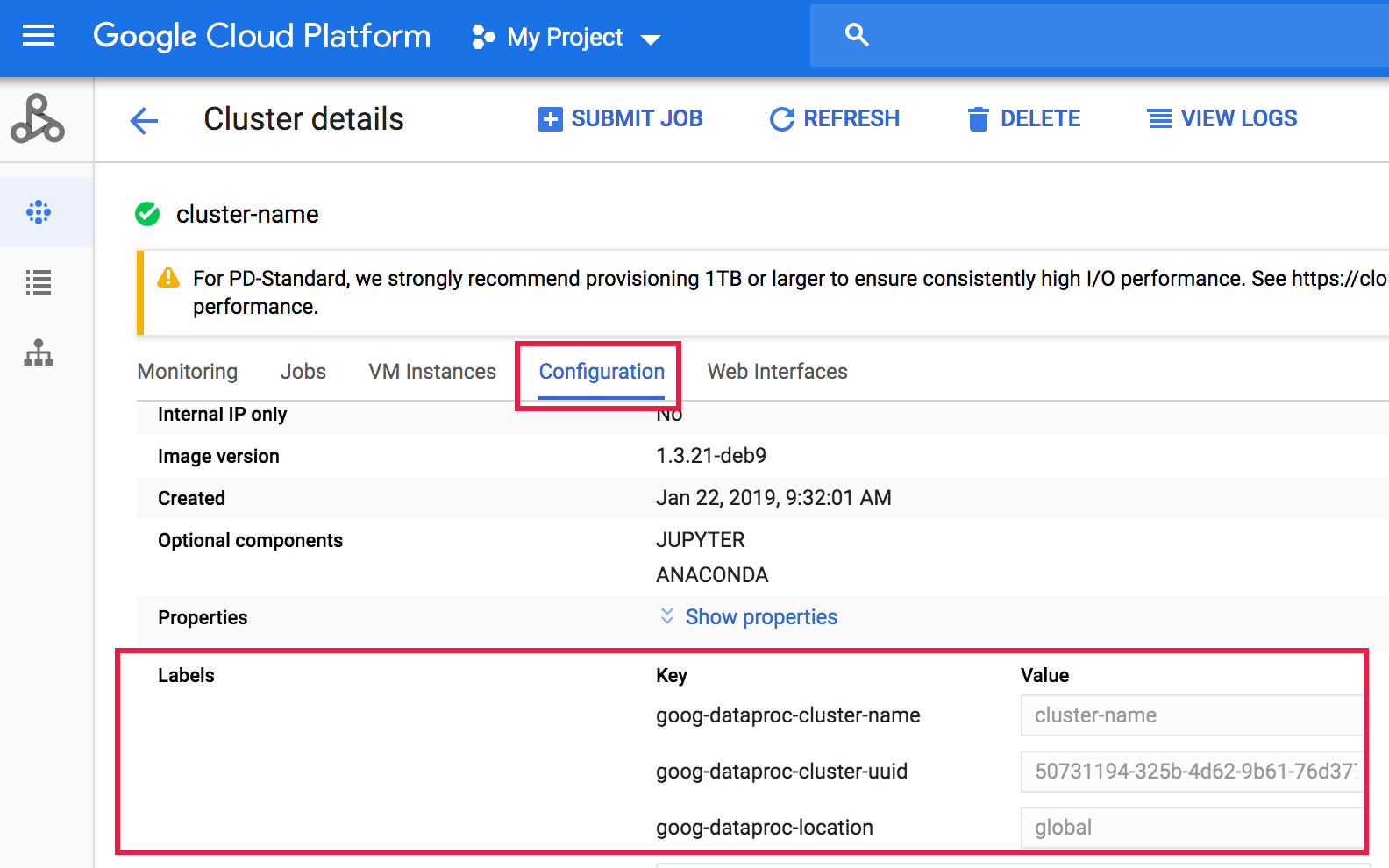 Cloud Dataproc Cluster - 로그 이름: log name