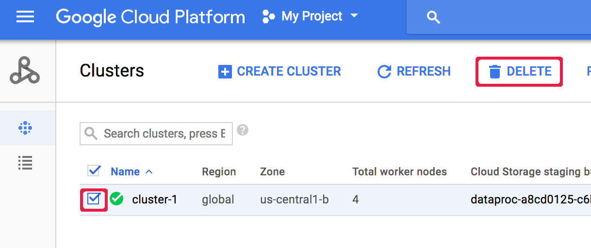 Open the Dataproc Clusters page in the Google Cloud console. Select the cluster by checking the box to the left of the cluster name, then Click Delete to delete the cluster.