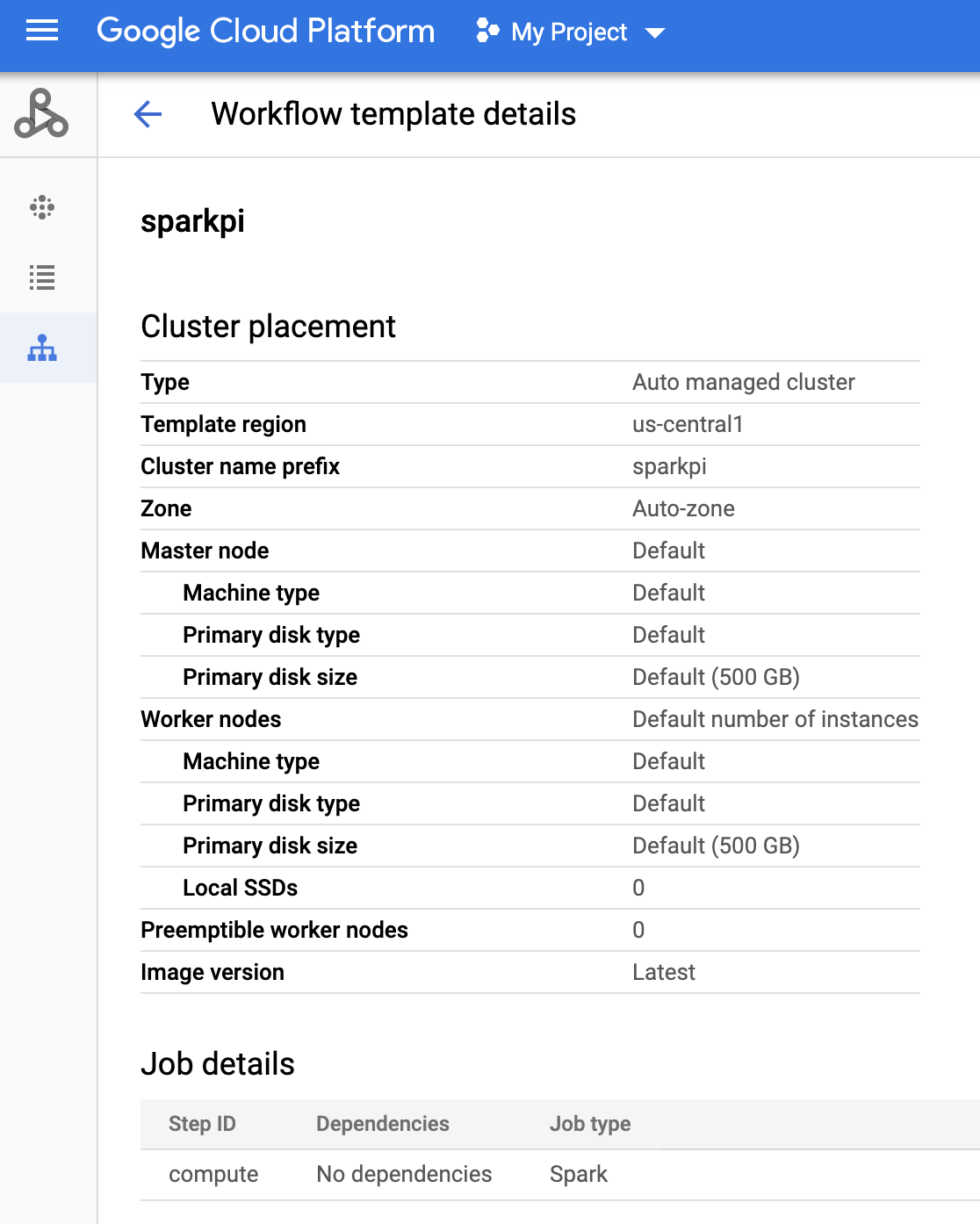 sparkpiname on the Dataproc Workflows page in the Google Cloud console to open the Workflow template details page. Click the name of your workflow template to confirm thesparkpitemplate attributes.