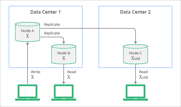 圖 1 展示具有最終一致性的複製概念。此圖說明儘管隨時都能讀取副本,但部分副本遲早會發生與來源節點最新寫入值不一致的情況。在本圖中,節點 A 為來源節點,而節點 B 和節點 C 為副本。