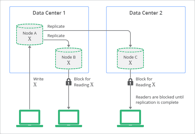 圖 2 所展示的是,具有強式一致性的部署拓撲及複製程序的概念。在該圖中,您可以看到副本如何總能具有與來源節點相同的值,只不過在更新結束之前無法供人存取。