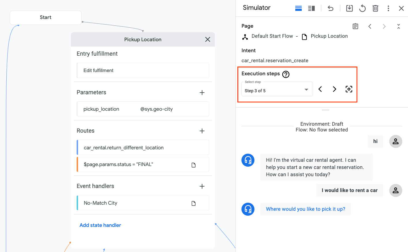 El visor de pasos de ejecución del simulador te permite cambiar entre los pasos de un turno de conversación específico y centra los elementos relacionados del creador de agentes en cada paso. En el siguiente ejemplo, la entrada del usuario final "Me gustaría alquilar un coche" activa cinco pasos de ejecución y transición: