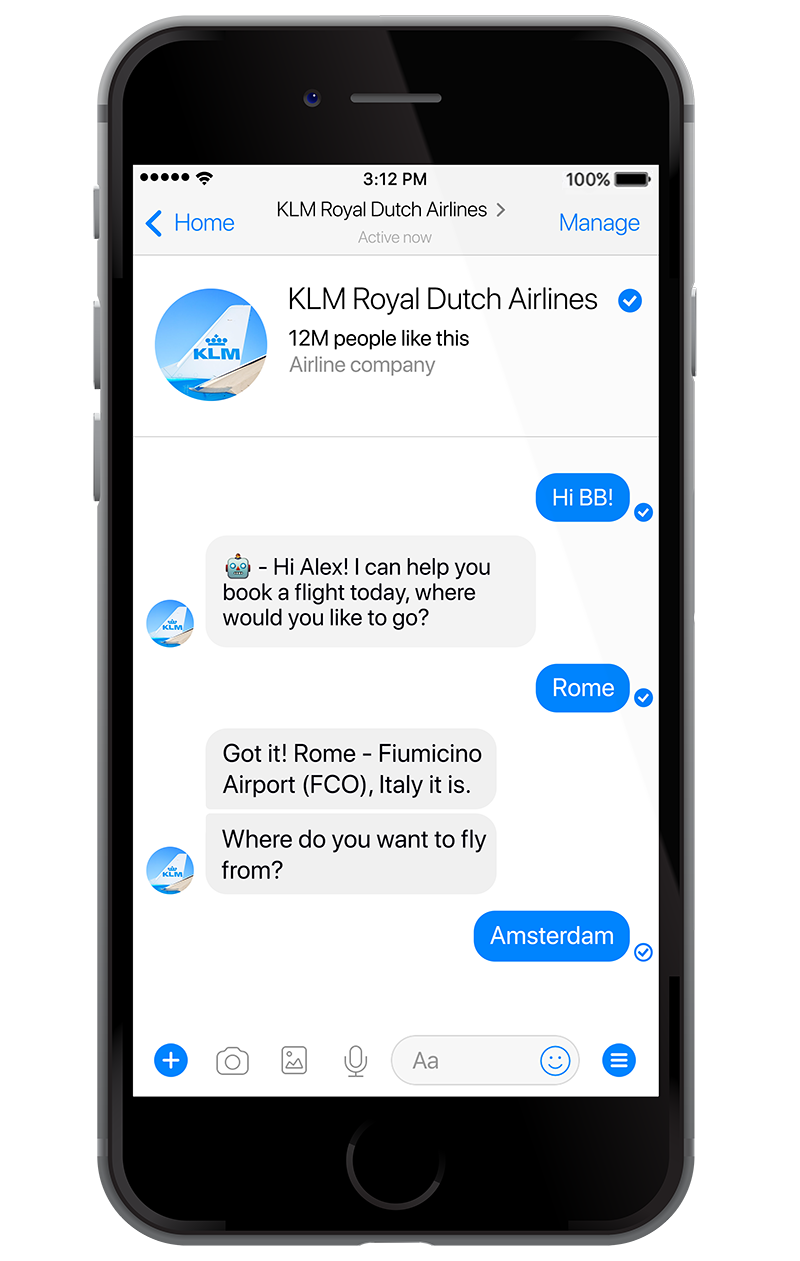 El primer proyecto de la aerolínea fue un bot de reservas para Facebook Messenger, que lanzó en septiembre del 2017. KLM lo bautizó como "BB", de Blue Bot (azul, el color característico de la aerolínea). La personalidad de BB es femenina, servicial, amable y profesional. También es un poco rebelde y, de vez en cuando, incluso hace alguna broma. "Si quieres hacer una reserva a través de Messenger, BB te preguntará cuál es tu destino, cuándo quieres volar, etc.", explica Van der Lee. "Te mostraremos las opciones y podrás comprar, rellenar tus datos personales y recibir la confirmación de la reserva, todo en la aplicación conversacional". Al conectar BB con el sistema de gestión de relaciones con los clientes de KLM, un agente humano puede tomar el control fácilmente si no puede responder.