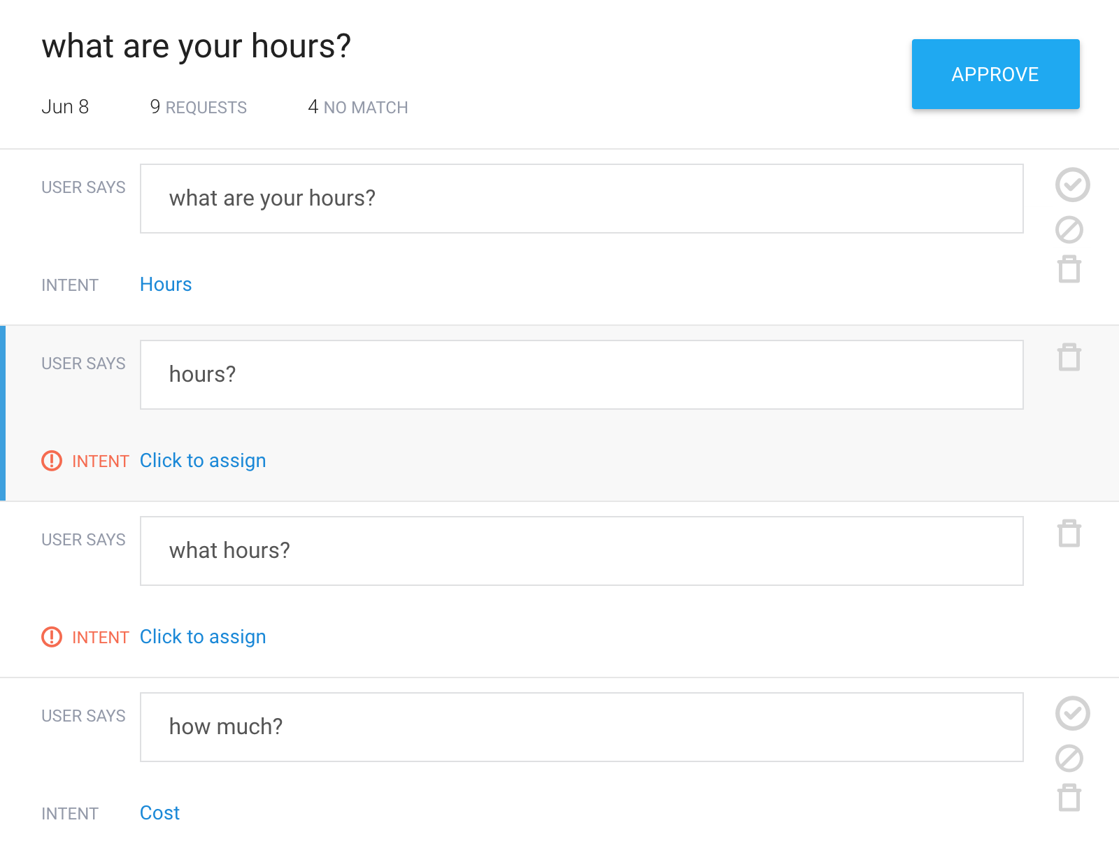 Wenn Sie die angezeigten Daten bearbeiten oder rechts auf eine Aufgabenschaltfläche klicken, erstellen Sie Aufgaben zum Aktualisieren der Trainingsdaten, die für den Speicherprozess in die Warteschlange gestellt werden. Wenn Sie mit dem Erstellen von Aufgaben fertig sind, klicken Sie auf die Schaltfläche Approve, um alle Aufgaben in der Warteschlange auszuführen. Nach der Genehmigung sollten Sie Ihren Agenten manuell trainieren.