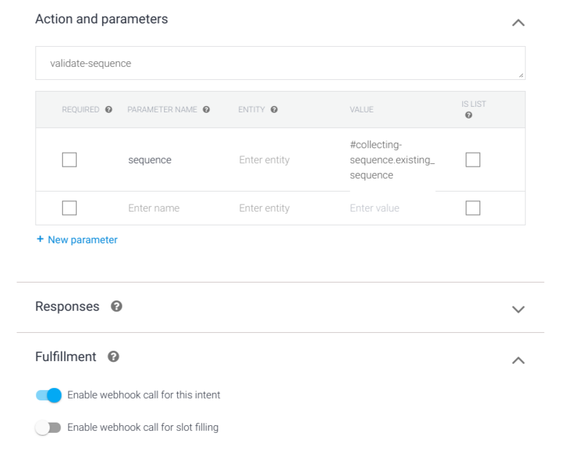 Tambahkan parameter yang diperlukan "new_sequence" menggunakan entity regexp yang Anda buat untuk mengumpulkan urutan parsial di bagian sebelumnya. Tetapkan jenis entitas ke "@alphanumeric" dan nilai ke "$new_sequence".