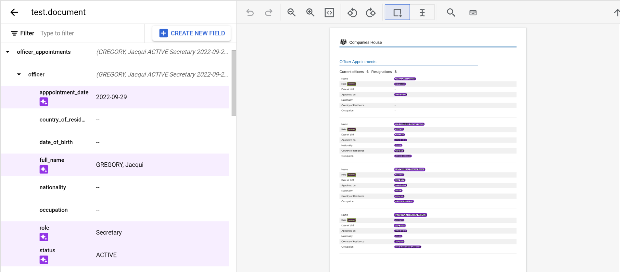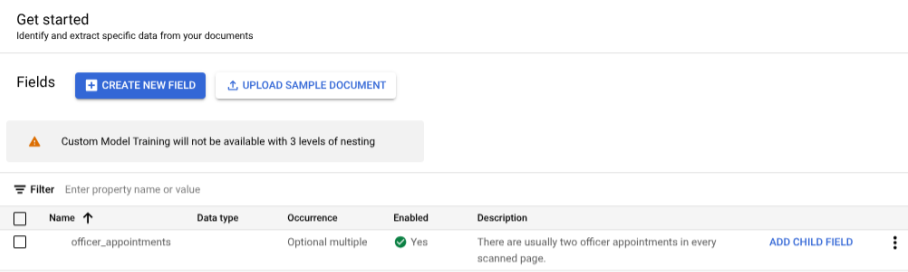 スキーマを設定すると、自動ラベル付けを使用して、3 つのレベルのネストを含むドキュメントから予測を取得できます。