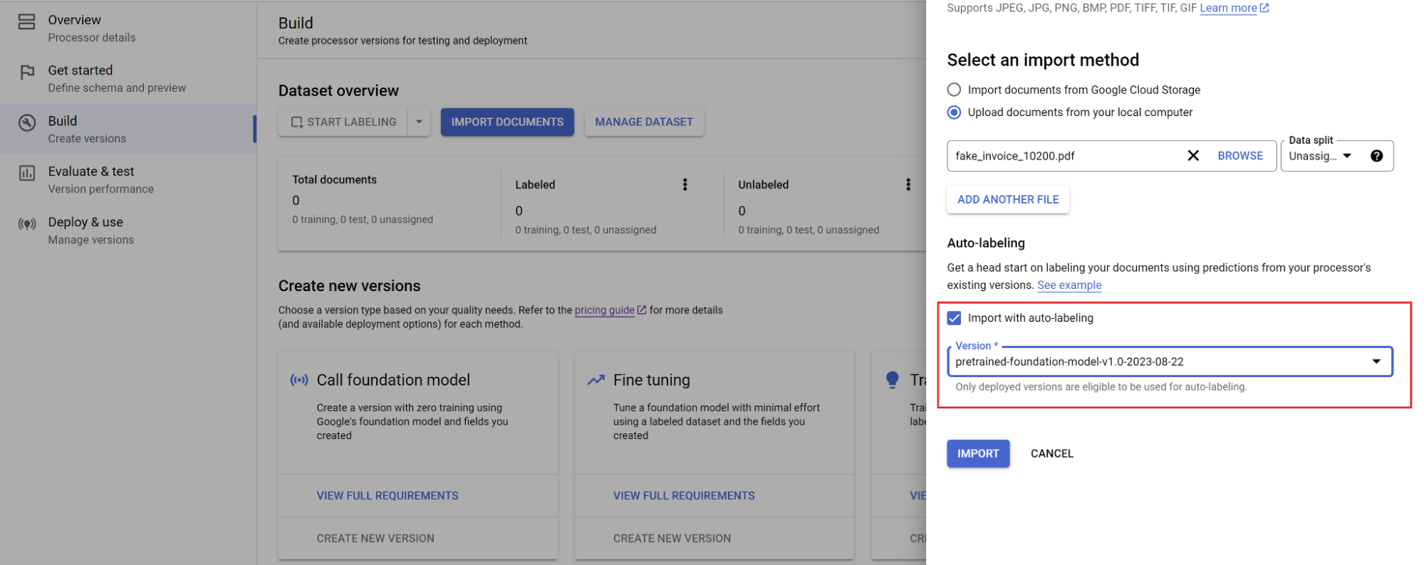ドキュメントのパスと、ドキュメントのインポート先のセットを選択します。自動ラベル付けオプションをオンにして、基盤モデルを選択します。