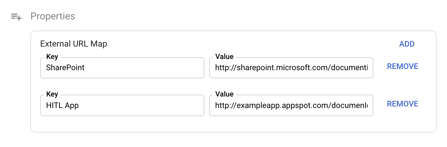 { "name": "defaultViewerUrl", "display_name": "Default Viewer URL", "is_repeatable": false, "is_filterable": true, "is_searchable": true, "is_metadata": true, "is_required": false, "text_type_options": {}, "schema_sources": [] }URL de l'application externe : il s'agit d'une propriété de carte lorsque les spectateurs utilisent différentes applications pour afficher des documents. Par exemple, un annotateur HITL peut ouvrir l'application HITL pour corriger des entités, tandis qu'un utilisateur professionnel ouvre l'application SharePoint pour examiner le document.