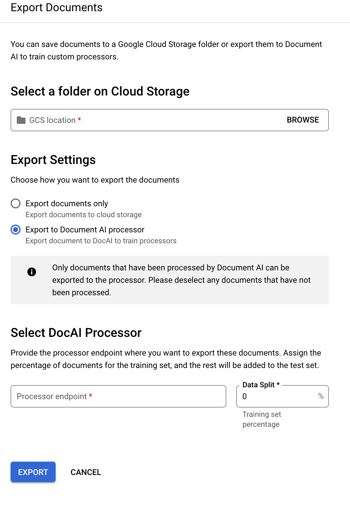 Selecione Exportar para o processador da Document AI para também exportar documentos para um conjunto de dados de extrator de documentos personalizado (CDE) no Document AI Workbench.