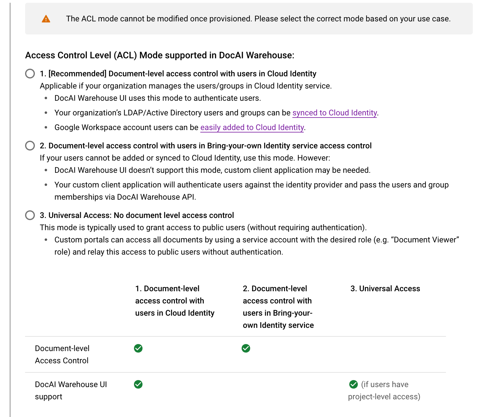 Document-level access control with users in Cloud Identity Document-level access control with users in Bring-your-own Identity service access control Universal access Document-level access Yes Yes No Document AI Warehouse UI support Yes No Yes (if users have project-level access)