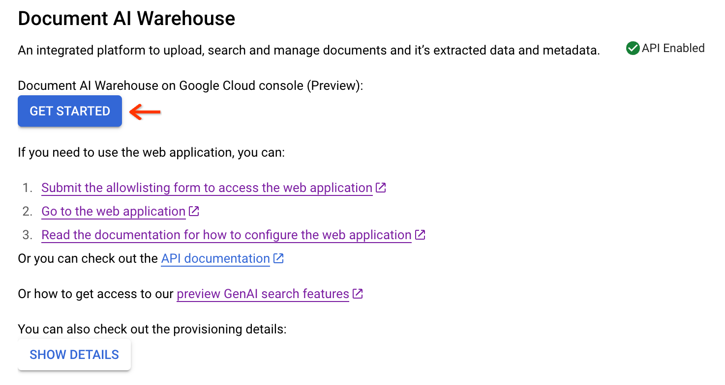 If you are in the allowlist to Google Cloud console UI features, you can click Get Started to start using Document AI Warehouse in the Google Cloud console.