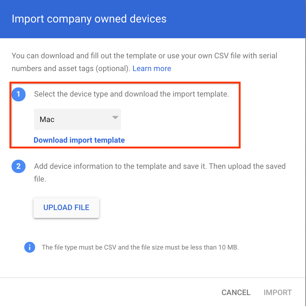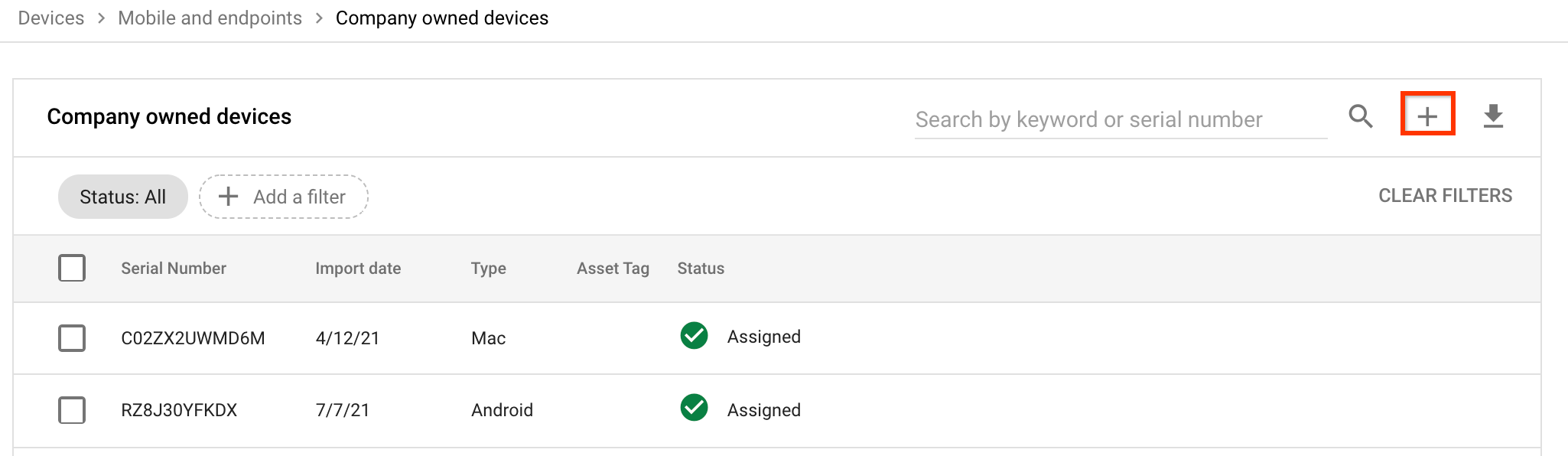 Para registrar dispositivos como propriedade da empresa, importe os números de série dos dispositivos no Admin Console.
