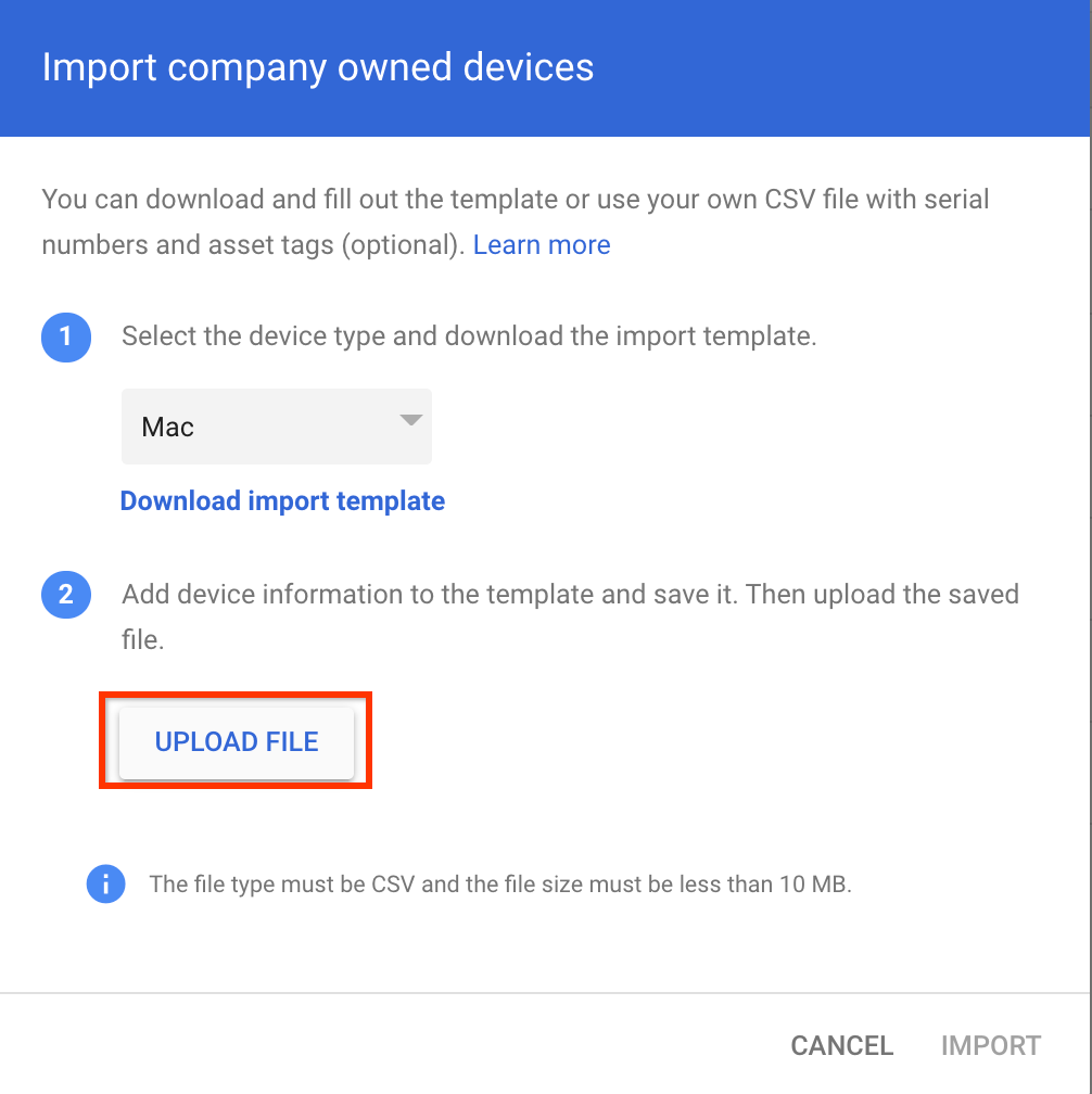 Na caixa de diálogo Importar dispositivos da empresa, clique em Fazer upload do arquivo.