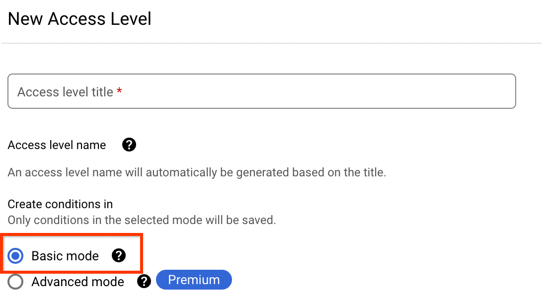• ACCESS_LEVEL_NAME ist der eindeutige Name für die Zugriffsebene. Er muss das folgende Format haben: accessPolicies/POLICY_ID/accessLevels/LEVEL_ID.