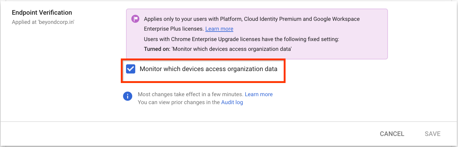 - Asegúrate de que esté marcada la casilla Supervisar qué dispositivos acceden a los datos de la organización.