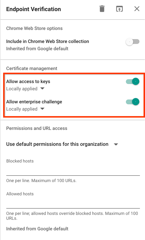 - 企業向けアプリの真正性確認を許可する: Endpoint Verification 拡張機能が ChromeOS で確認済みアクセス機能を使用できるようにします。詳しくは、Chrome の確認済みアクセスの概要をご覧ください。