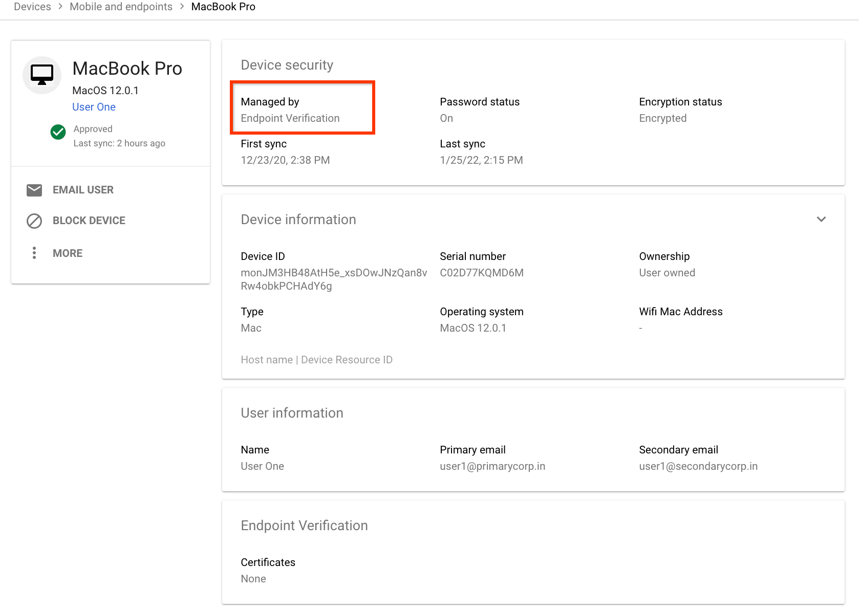デバイスの詳細には、デバイスが Endpoint Verification によって管理されていることが示されます。