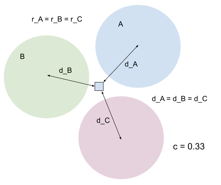 A의 분산이 B보다 크지만 중심점은 항목에서 동일한 거리에 있습니다. A가 항목에 더 큰 영향을 미칩니다. 엔티티가 A에도 할당되므로 신뢰도 점수가 0.5보다 커집니다. |