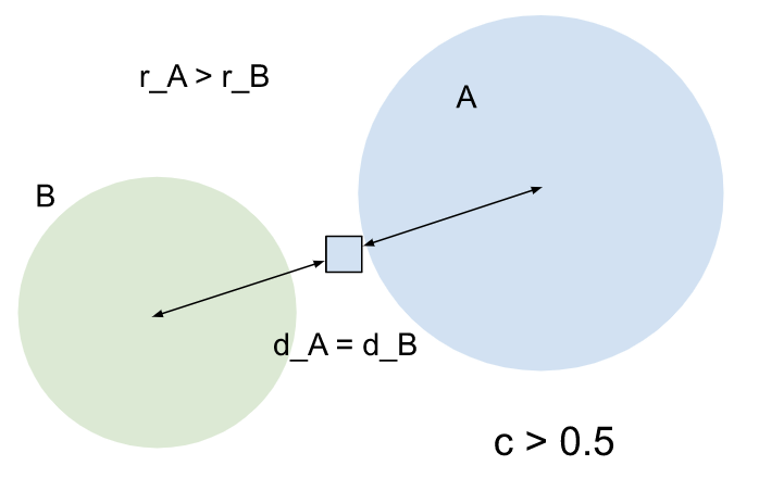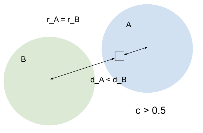 A 的分布範圍大於 B,但兩者的質心與實體的距離相等。 A 對實體的影響力較大。由於實體也指派給 A,因此可信度分數會大於 0.5。 |