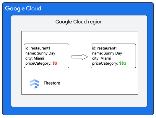Der Firestore-Client fordert die folgende Änderung an einem Dokument in der Sammlung Restaurant an, indem er den Wert des Felds priceCategory aktualisiert.