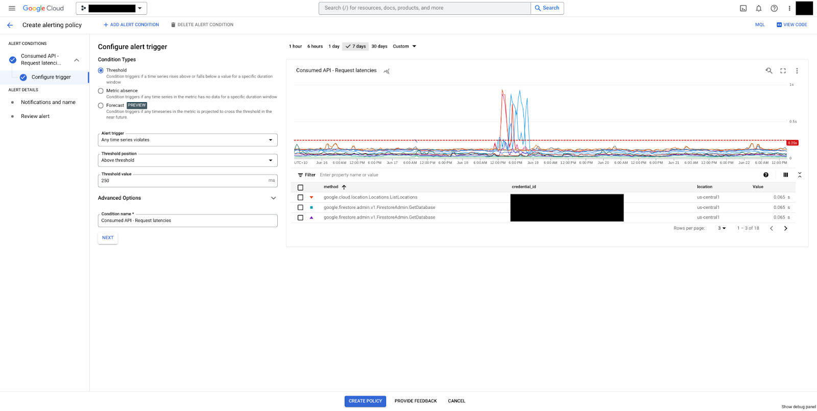Im folgenden Beispiel erstellen wir eine Benachrichtigungsrichtlinie für die Latenz. Die Benachrichtigungsrichtlinie prüft die P99-Latenz über ein rollierendes Zeitfenster von 5 Minuten. Wenn die P99-Latenz 5 Minuten lang über 250 ms bleibt, wird die Benachrichtigung ausgelöst.