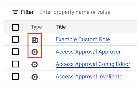 Los íconos de la columna Tipo indican si es un rol personalizado o un rol predefinido