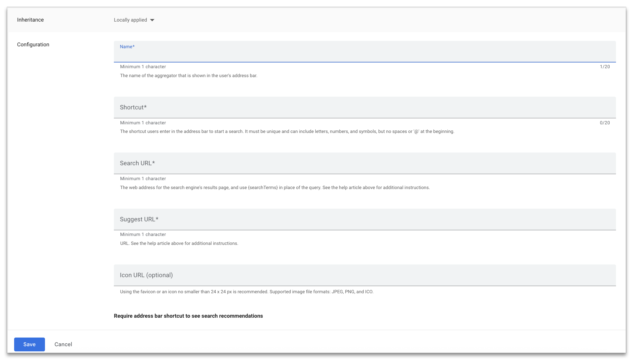 - Adicione um nome, um atalho, um URL de pesquisa e um URL sugerido e, de seguida, selecione Guardar.
