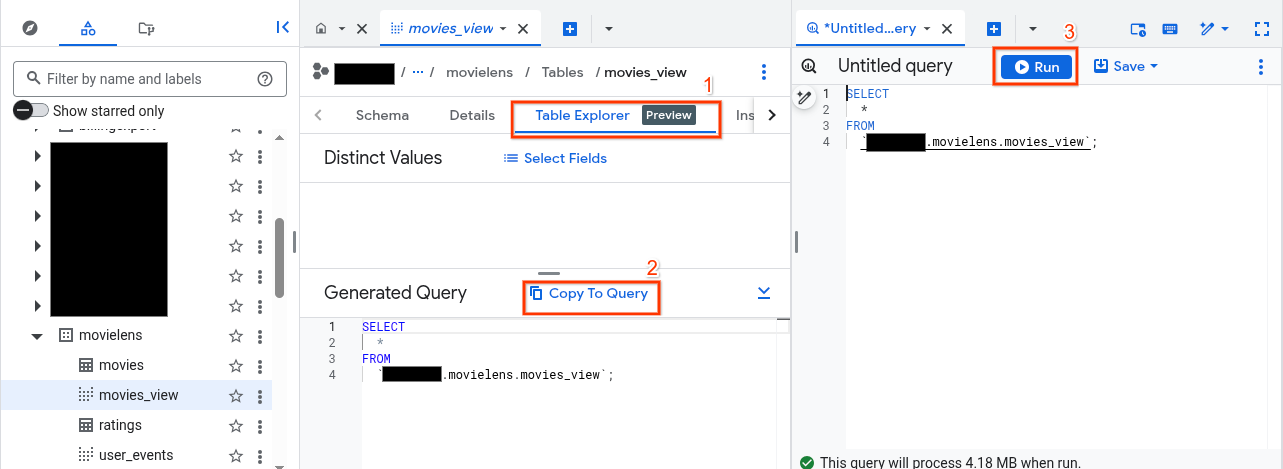 movielens, puis cliquez surmovies_viewpour ouvrir la page présentant le schéma de cette vue.Dans le volet Explorateur, vous pouvez également sélectionner l'onglet Explorateur classique, développer le nom de votre projet, développer l'ensemble de données