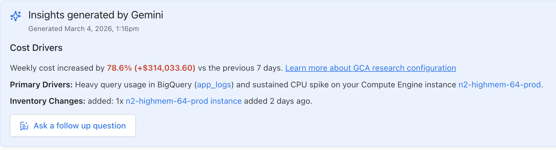 Os insights do Gemini Cloud Assist sobre mudanças recentes podem ajudar você a ter uma ideia rápida do custo e da utilização geral no seu projeto ou aplicativo.