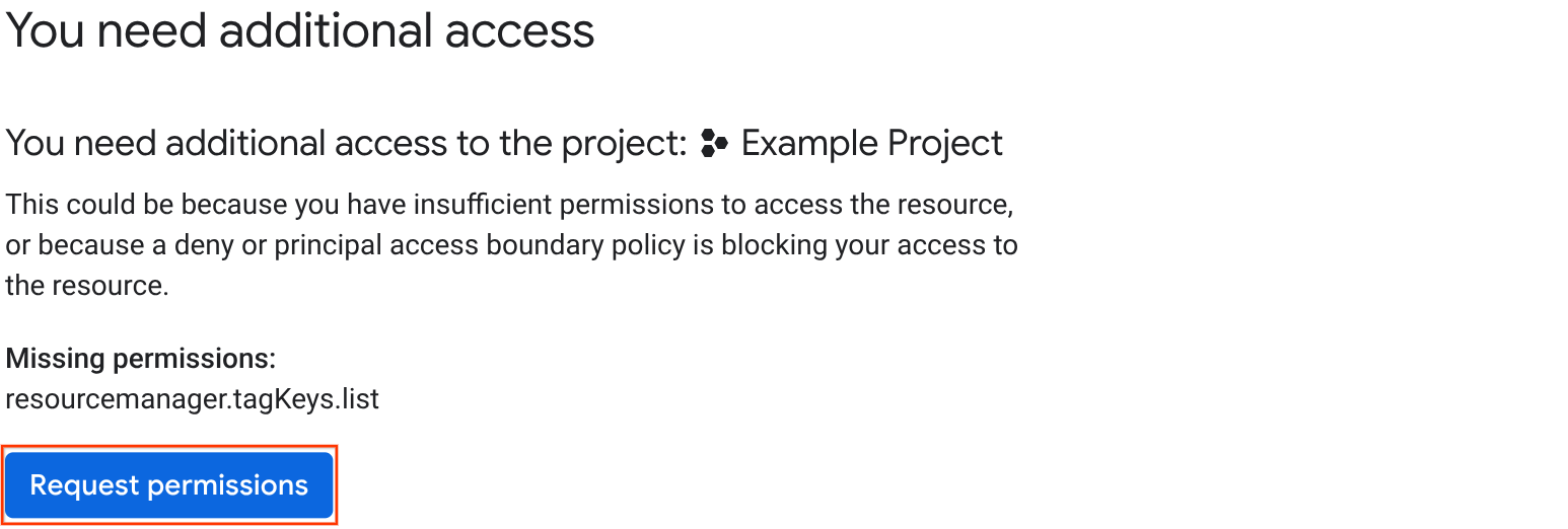 - No cumples los requisitos para acceder al recurso. Si estás sujeto a alguna política de límites de acceso de principales, el recurso al que intentas acceder debe incluirse en las reglas de límites de acceso de principales de las políticas. Si no es así, Google Cloud muestra un mensaje de error.