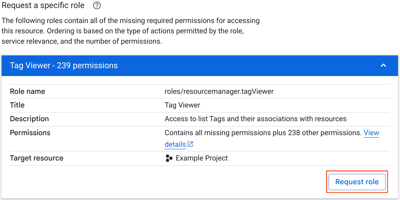 En la sección Solicitar un rol específico, consulta la lista de roles recomendados y elige el que quieras solicitar. Puede hacer clic en los roles para ver más detalles sobre ellos. Esta sección solo se muestra si el error de permiso se debe a una política de permiso.